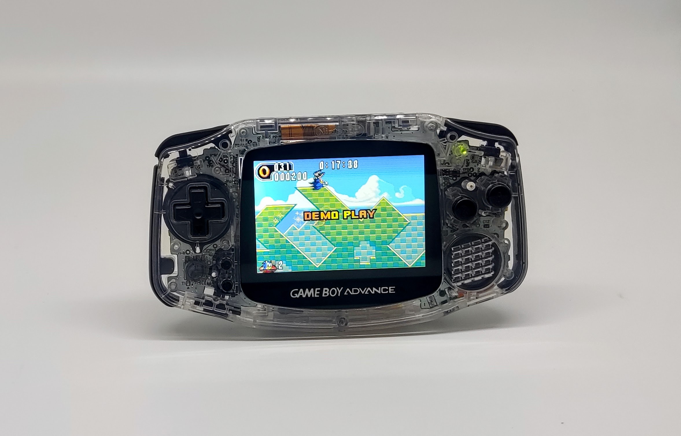 There is also a brightness touch sensor below glass lens behind the Gameboy Advance logo.